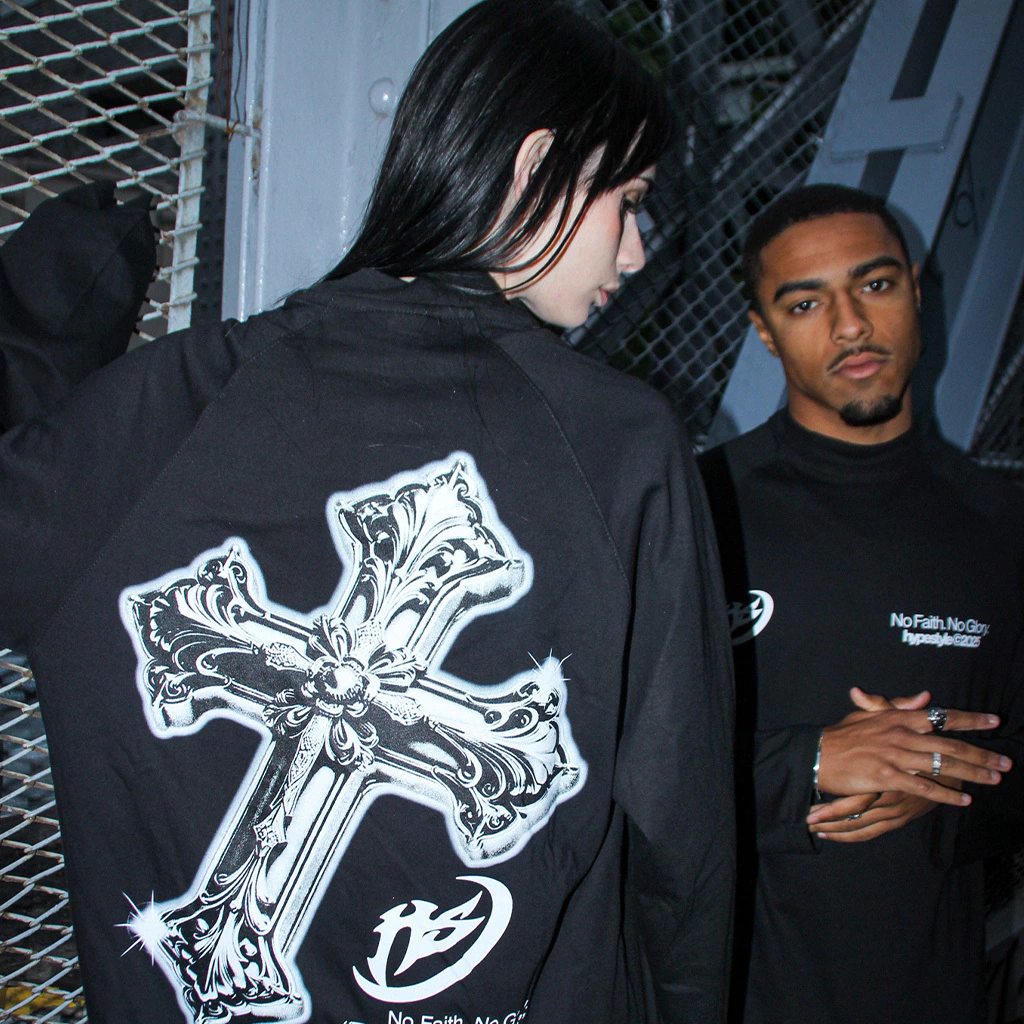 Estampado frontal minimalista con logo Hypestyle y lema No Faith. No Glory. en blanco